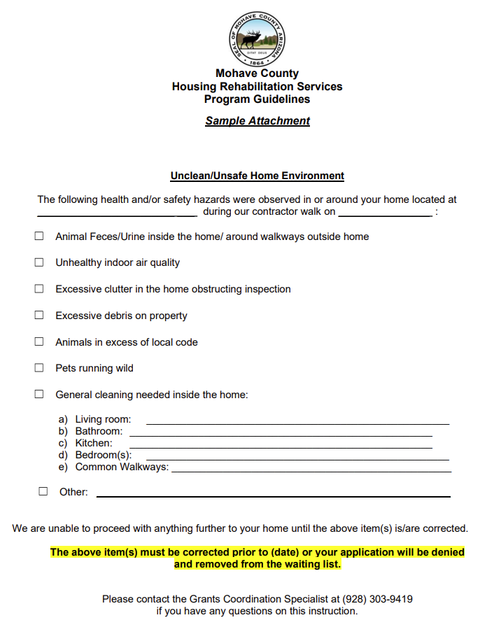 These programs are designed to improve the housing conditions in Mohave County by alleviating immediate health and safety issues in the home, including code violations, weatherization/energy efficiency, and accommodations for accessibility.