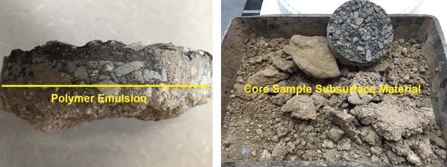Rosy Canyon Road stabilizer selection derives from core sample evaluation on long-term polymer emulsion and cutback asphalt performance. This evaluation references hard surfacing works completed approximately 8 years prior to core sample extraction. Figure 4 illustrates polymer emulsion performance under roadbed soil application with protective chip seal surface treatment, which indicates the stabilizer degrades over time. This loss of cohesive soil bond significantly detracts from long-term stability of the hard surfacing work.