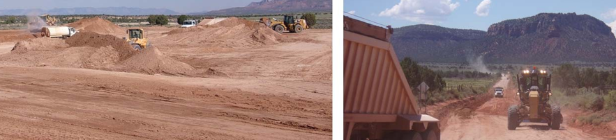 Rosy Canyon Road subsurface stabilization reflects rigorous review and engineering consistent with the discussed methodologies toward assuring Project long-term performance. NRCS soil maps infer roadbed soils dominantly consist of silty sand, a USCS SM group soil, with approximate 18 percent remaining balance of silty clay, a USCS CL-ML group soil. Correlating MR as weighted average of roadbed soil composition through the Project approximates at 19 ksi (131 MPa). Mohave County’s access to select granular fill and specification-grade aggregate near Rosy Canyon Road drove its mechanical soil stabilization approach to achieve Design “Supply” Structural Number exceeding Operational “Demand” Structural Number over 20-year Project service life. The select fill, a silty clayey gravel laboratory graded as USCS GC-GM group soil, constitutes Project subbase course at minimum 20 cm thickness. Figure 6 highlights County forces transporting, placing, and compacting the subbase in advance of contractor delivered base course construction, stabilization, and hard surfacing. Aggregate base course meets County adopted Maricopa Association of Governments (MAG) Specification 702 for base materials [11]. Base course material represents USCS GP-GM group soil placed at minimum 10 cm thickness.