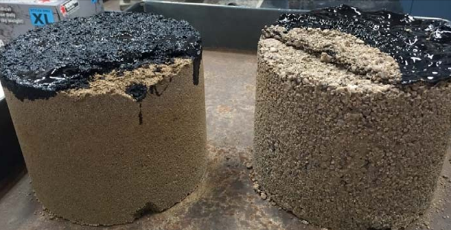 Mohave County commands extensive experience on soil stabilizer performance. This includes cutback asphalt and polymer emulsion use in past soil stabilization and hard surfacing work. Qualities fundamental to stabilizer performance concern penetration and cohesion to the prepared base course. The County, through its Public Works Department, made notable findings in laboratory testing and examination of core samples from past works in assessing cutback asphalt, asphalt emulsion, and polymer emulsion as candidate stabilizers for Rosy Canyon Road application. Having not used asphalt emulsions, a common chip seal binder, in hard surfacing work, the County tested stabilizer penetration using core samples retrieved from recent soil stabilized base courses on County roads to assess performance expectation. As such, findings show this bitumen formulation provides inadequate, approximately 3 mm penetration as exhibited in Figure 3.